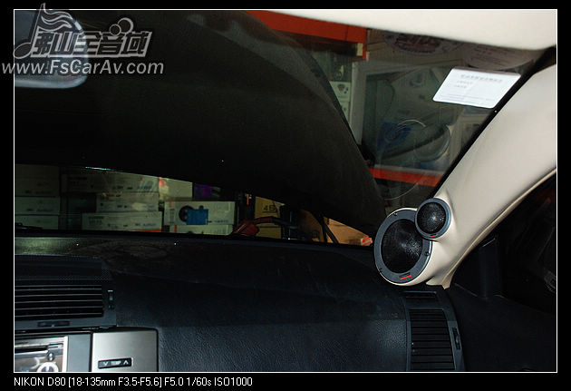 丹拿的中音與高音倒模在A柱。首先要把儀表臺保護好,然后把做好的墊圈固定在A柱上,經過反復的操作與試聽,才固定在最好的位置上。